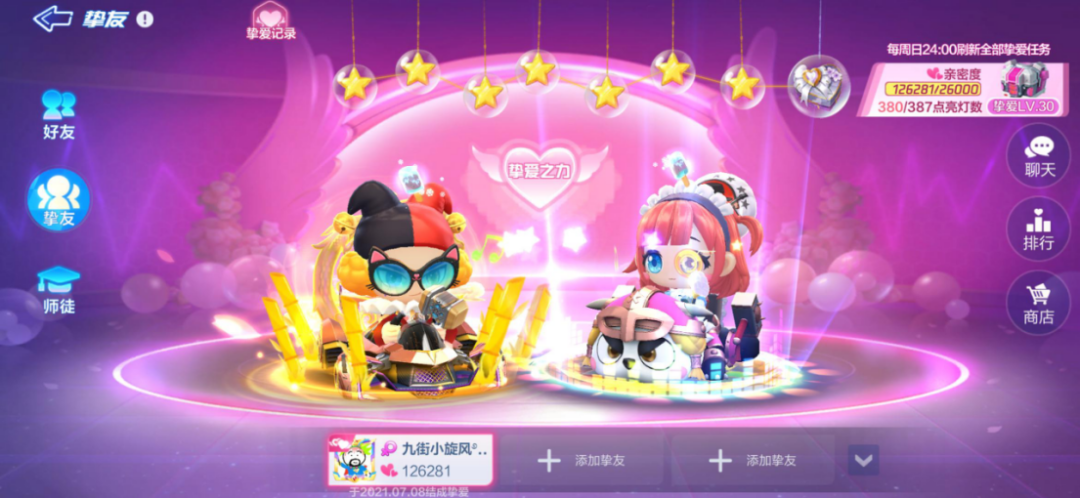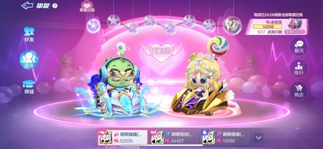 我老婆对游戏没什么兴趣,不过也经不住我的软磨硬泡,答应和我一起玩手游。在11.01推出挚爱的第一天,就结成了挚爱。这里还有一个小插曲,因为酷币那时候比较稀缺,我没舍得总自己的酷币购买情书,用了她的号给自己发送情书,至今还在因为这个事儿被吐槽。