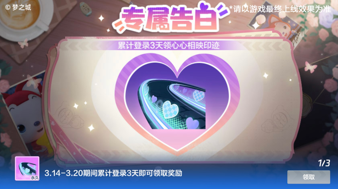 3月14日—3月20日期间,只要车友们累计登录游戏满3天,即可获得心心相映印迹奖励,是永久的哦~