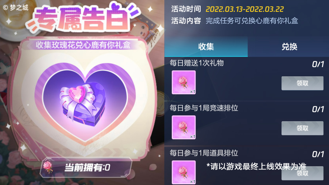 在游戏内,完成每日专属任务,就可以获得玫瑰花碎片,累计获得的玫瑰花碎片,可以兑换心鹿有你礼盒和酷币哦~颜值能打实用升级,这波玫瑰,有点东西哦。