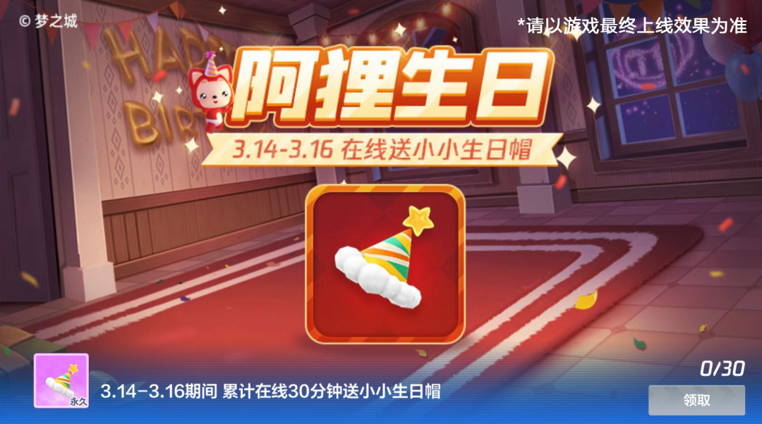 3月14日—3月16日期间,车友们只要累计在线时长满足30分钟,就能领取这顶萌萌哒的小小生日帽,听说戴着生日帽许愿,更灵验~