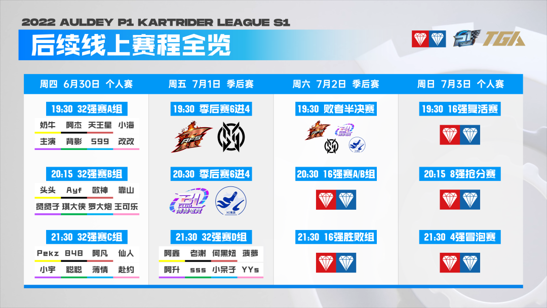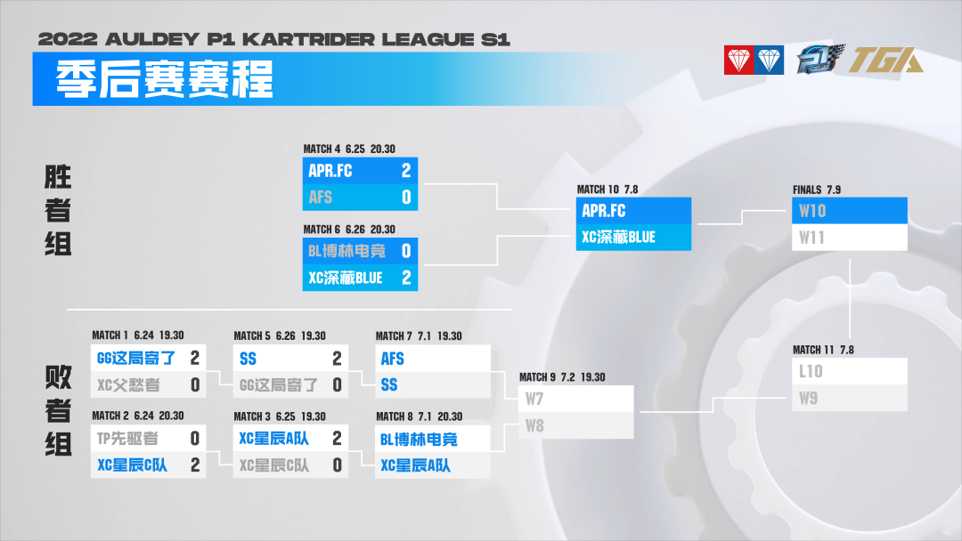 Apr.FC和XC深藏BLUE率先进入7月8日的成都线下决赛圈,恭喜他们!与此同时,AFs、SS、BL博林电竞、XC星辰A队将于7月1日-7月2日的季后赛第二阶段赛事中争夺最后一张进入成都线下决赛圈的门票!季后赛的比赛将会愈加精彩,车友们敬请期待!
