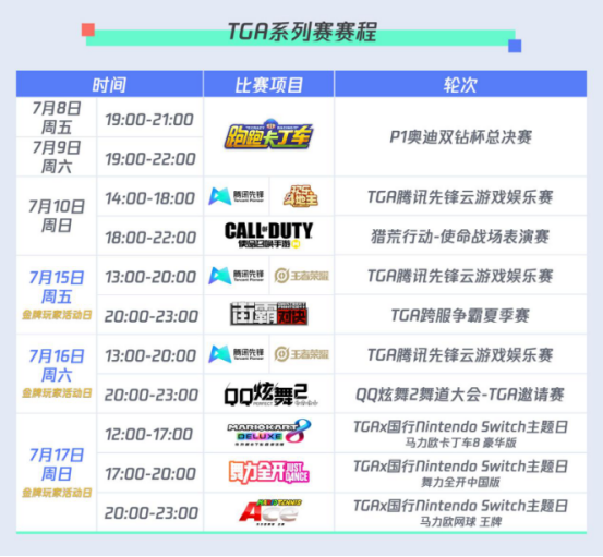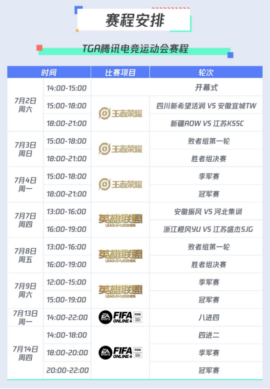 2022 TGA夏季总决赛比赛时间为7月2日-7月17日,由TGA腾讯电竞运动会和系列赛两大赛事组成。腾讯电竞运动会方面,涵盖了英雄联盟、王者荣耀、FIFA Online 4三大热门项目,来自全国各省队的数百名电竞选手,将在这里共竞荣耀,追逐电竞梦想。