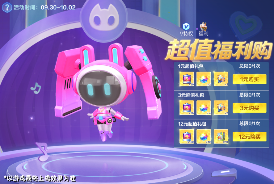 9月30日-10月2日,福利站将限时开启【超值福利购】活动,活动期间可直购超值礼包,支付成功后可立即获得不同档位电池、星愿结晶、炽金启动器、宝宝礼物盒等对应礼包奖励。直购金额自动计入V积分,并支持激活招财猫和进宝猫。