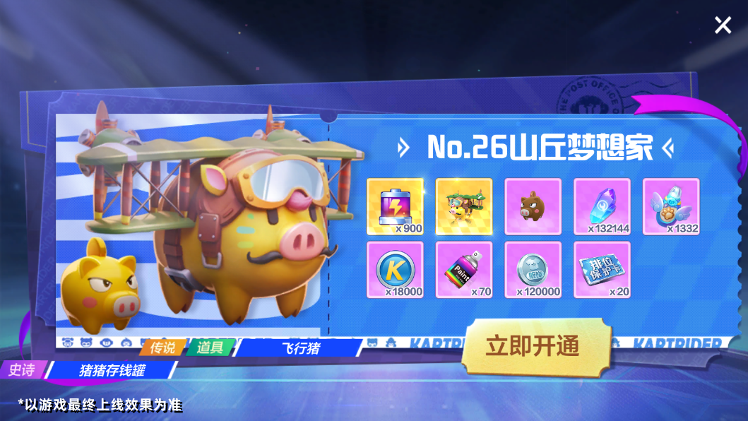 NO.26期通行证【山丘梦想家】将于10月1日盛大开启!传说级道具赛车【飞行猪】、史诗级宠物【猪猪存钱罐】,将分别在荣誉通行证和活跃通行证中与大家见面!先让宝宝带着大家先睹为快吧~