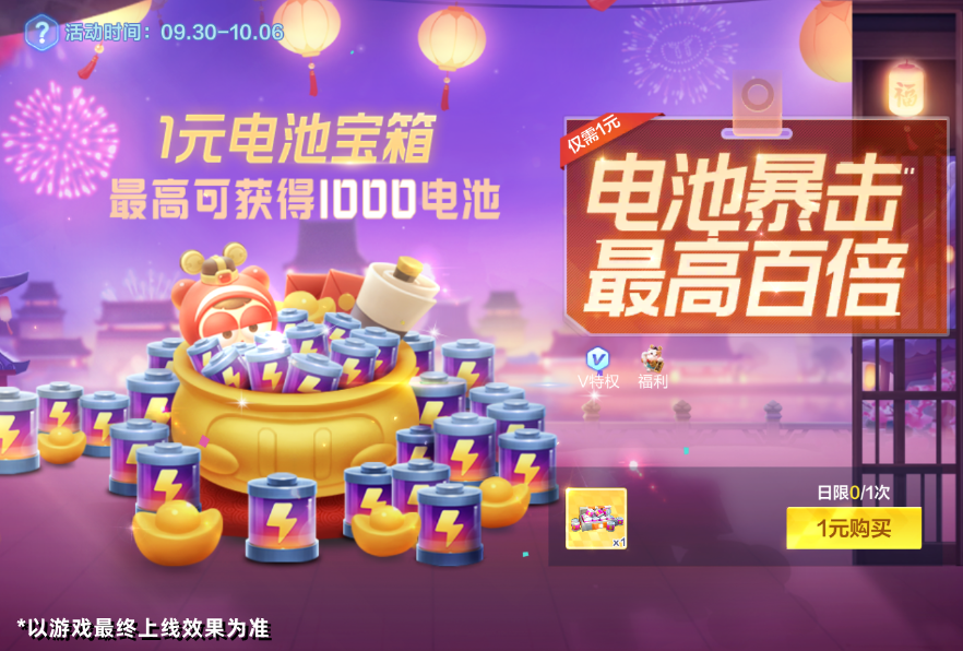 9月30日-10月6日,福利站将限时开启【1元电池暴击】活动,活动期间每日可直购1次1元电池宝箱,开启宝箱可随机获得电池,最高可获得1000电池哦~直购金额自动计入V积分,并支持激活招财猫和进宝猫。