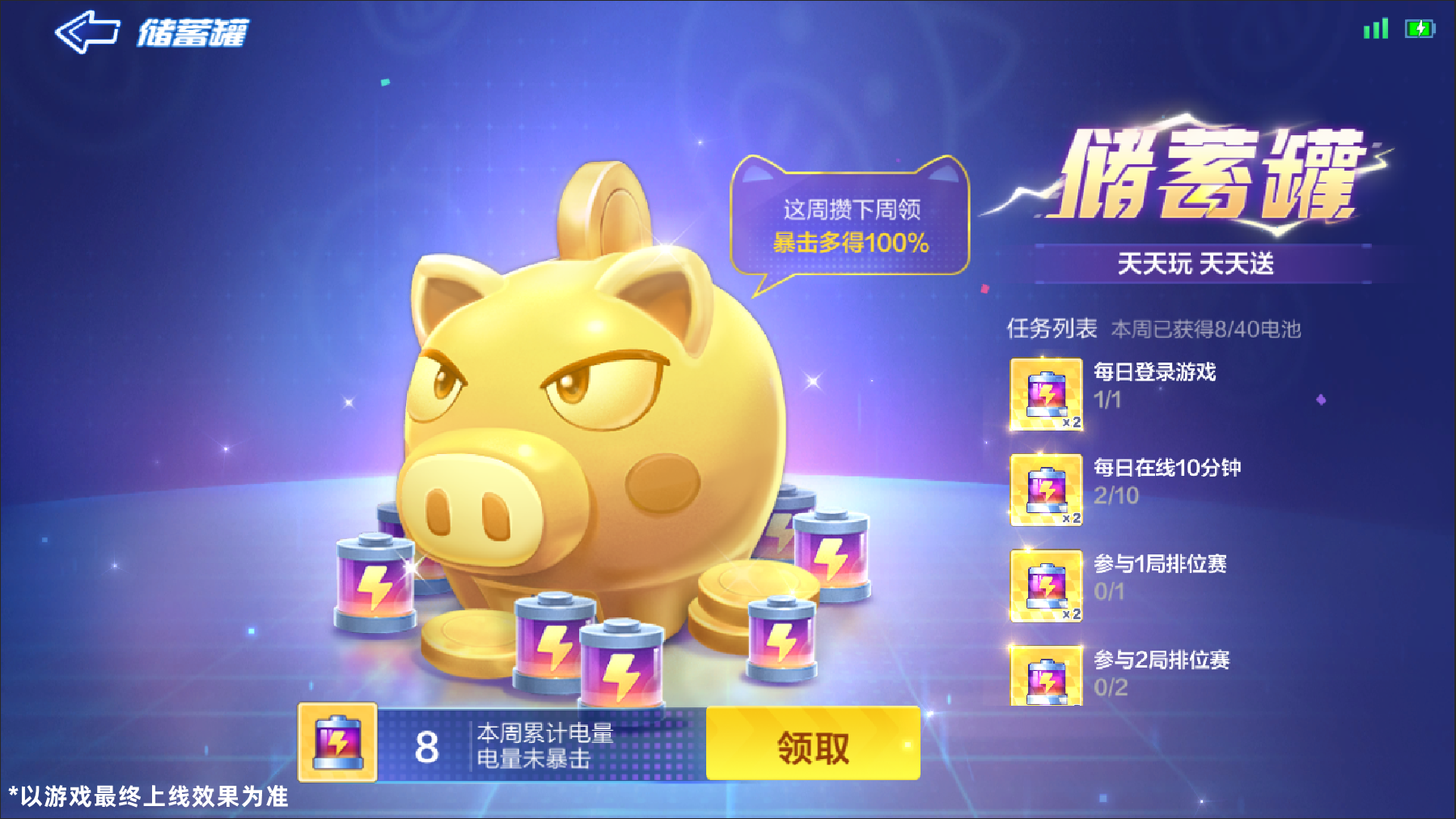 车友们仅需每日完成轻松简单的任务,即可将任务奖励的电池存到自己的金猪储蓄罐内,每周最多可存入40电池!储蓄罐内的电池随时可以直接领取使用,不过车友们如果将本周存到储蓄罐内的电池放到第二周后再行领取,即可将其100%暴击为双倍电池!这周攒,下周领,天天玩,天天送!福利轻松领,电池大放送!新赛季金猪储蓄助力车友早日实现电池自由~