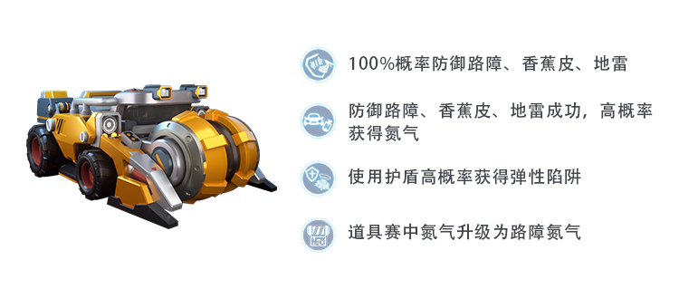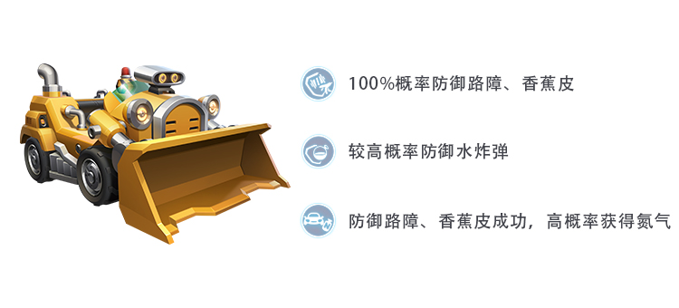 1技能完全免疫路障、香蕉皮、地雷是工程车的标志性技能,使得工程车可以肆无忌惮地冲破这些障碍的阻拦。